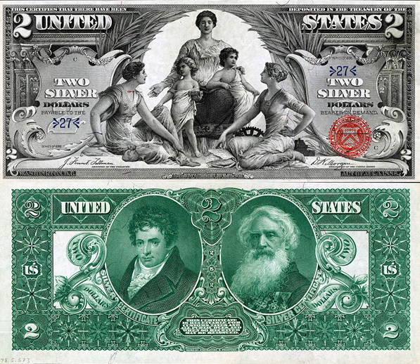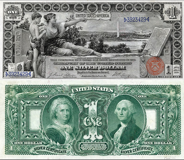 The 1896 Series Silver Certificates are considered by some to be the most elegant and beautiful notes printed by the United States. Although the obverse is in grayscale, all three denominations depict neoclassical allegorical vignettes which impart a respect for learning and those who teach. The $1 note depicts “History Instructing Youth”, designed by one Will Hicok Low, thus the name “Educational Note”.