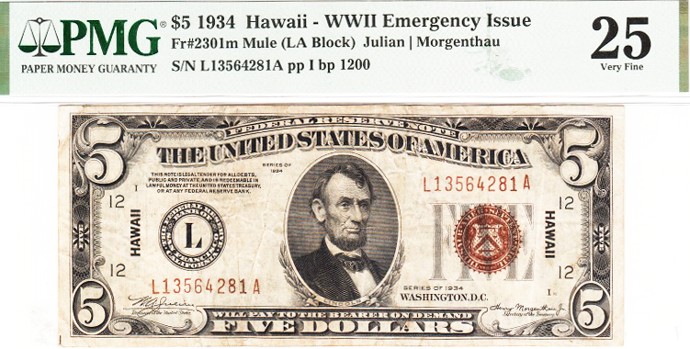1934 Series $5 Hawaii WWII Emergency Federal Reserve Note Mule