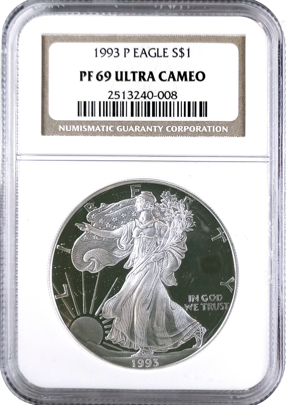 The 1993 P American Silver Eagle Proof, NGC PF69 Ultra Cameo, is an extraordinary addition to any coin collection. As a certified proof coin with an ultra cameo designation, it boasts unparalleled craftsmanship, fine details, and a striking mirrored finish that highlights the artistry of its design. Whether you’re a seasoned collector or a novice enthusiast, this coin offers undeniable value by combining historical significance with minted precision.